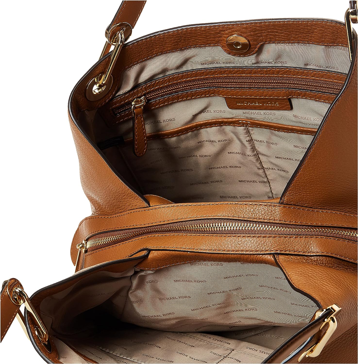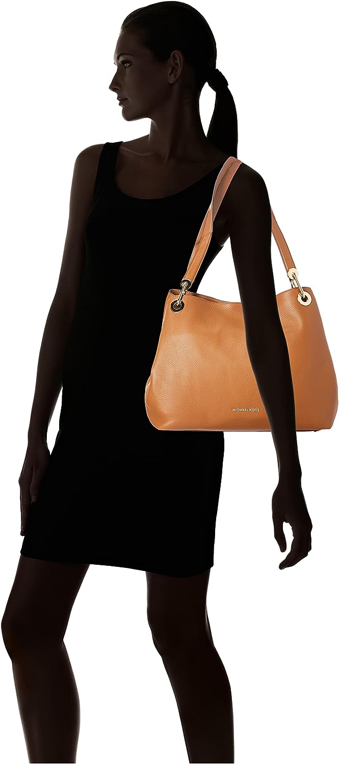 Michael Kors Raven shoulder bag in pebbled leather with gold-tone hardware. Features multiple pockets, including a center zip pocket, and two leather shoulder straps with an 11" drop.
